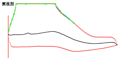 打开鞋楦"EBW_6_5E.gsm"(该文件是在LastLib文件夹中)。 点击菜单"常用->调节鞋帮形状",显示调节鞋帮形状对话页如右上图所示。 与此同时侧视图中显示绿色的曲线及控制点。用鼠标拖动控制点可改变曲线的形状。用户可以在"鞋帮高度"栏中输入所需高度,然后点击"默认轮廓线"来设置鞋帮轮廓线,最后调节控制点位置来设定轮廓线。 在"筒口宽度"栏中设定筒口前、后部的宽度。点击"预览"预览修改结果,点击"确定"完成修改。 |