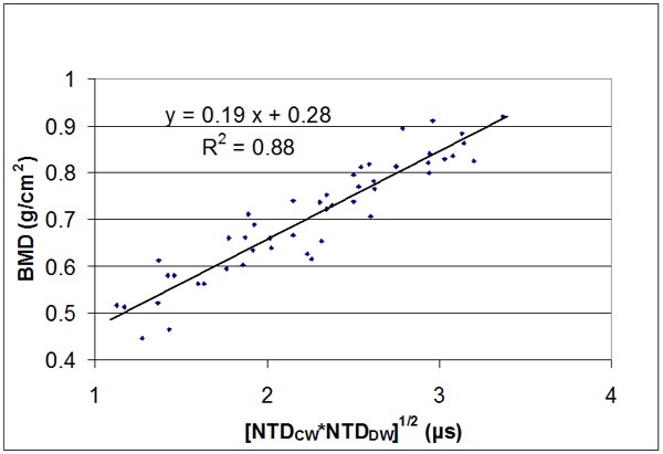 In a clinical study, forty-nine adult subjects were recruited for this study at Columbia University under an IRB approved protocol. Each subject was measured at the 1/3rd radius with the UltraScan 650. For each subject radial bone density at the same 1/3rd location was determined using DXA. For this clinical data, plots showing the relationships of [NTDCW*NTDDW]1/2 vs BMD, together with a linear regression curve fit, are shown in figure above. The linear correlation between them was r = 0.94. In the figure, the parameter [NTDCW*NTDDW]1/2 was determined ultrasonically with the UltraScan 650 and BMD was measured using DXA.