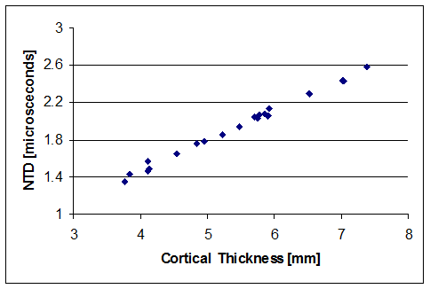 For example, the figure below shows simulation results on twenty (20) human radial cross-sectional images. As may be seen, there is excellent correspondence between the NTD and cortical thickness (this data has an R-squared value of 0.98).