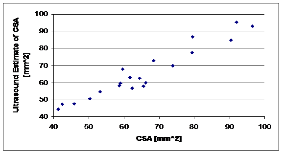 As may be seen, there is good correspondence between the ultrasound and bone mass data, with R-squared values of 0.83 for cortical thickness and 0.90 for cortical cross-sectional area.
