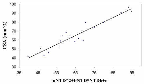 The figure below shows the correlation obtained in simulations between the cortical cross-sectional area (CSA) at the same 1/3rd location of the radius, with an ultrasound based estimate at the same site. The ultrasound based estimate uses a non-linear combination of two distinct NTD parameters; please see the papers referred to above for technical details. Note that the cortical CSA is generally proportional to the bone mineral content in grams measured with dual-energy x-ray absorptiometry (DXA). This data has an R-squared value of 0.88.