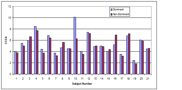 The data (see the bar graph below) showed that the dominant arms had 5.8% more cortical cross-sectional area, although there was a relatively high degree of variability (in 7 of the 21 subjects the non-dominant arm had a larger CCSA) and the P-value was equal to 0.17.
