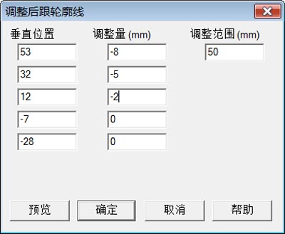 点击菜单"常用->调整鞋跟背部"。这命令将在打开如右图所示的对话页,并在侧视图中鞋跟背部,添加五条蓝色线段。这些线段的垂直位置由对话页中"垂直位置"栏控制,对应这些垂直位置的鞋跟背部的最大调整量(水平移动)由对话页中"调整量"栏控制。 鞋跟背部的调整范围由对话栏"调整范围"栏控制。例如调整范围=50 mm,意为调整量在鞋跟背部为最大。随着位置向前移动,调整量减少,至离鞋跟背大于或等于50mm处调整量为零 |