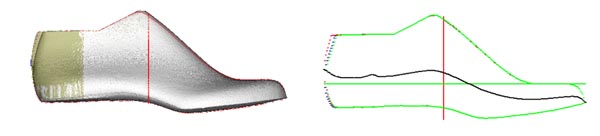 假设我们要增加鞋跟背上部空间约5-6mm,在对话页中输入如右上图显示的数字,然后点击"预览"按钮检查结果。如果满意,点击"确定"完成这项工作。 这一后弧调整的结果如右图所示。 |