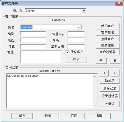 在完成“操作者”的设定后,右图所示的"客户文件夹"对话页将会出现。 在此对话页中,您可以从"姓名"下拉栏中选择一个客户,或点击“新客户”按钮,添加一个新的客户。 例如,从"姓名"下拉栏中选择"Sample"(样本),然后点击"OK"继续。 在此后的操作中"Sample"(样本)是当前文件夹。 |