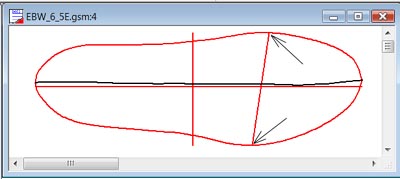 定义斜宽线(球线): (1)点击菜单"常用->定义斜宽线"; (2)双击你要定义斜宽线的两端,如右图箭头显示。 信息将显示"斜宽线已定义,...。", 提示:在鞋楦上,斜宽线通常在前部最宽处靠前一点的位置,如右图所示。 你可以在俯视图或实体视图中定义斜宽线。 |