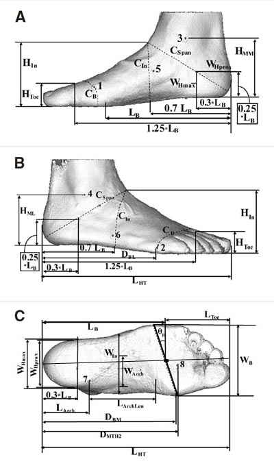 脚中线:(右图C)从脚跟中间至二趾根中间。 斜宽线(脚球线):(右图C)从大脚趾根关节到小脚趾根关节(第一跖趾关节点和第五跖趾关节),与中线夹角约8至14度。 脚球长(LB):(见右图C)从后脚跟至球线(斜宽线)中间。 脚全长(LHT):(见右图B,C)从脚跟到脚趾尖。 脚球宽(WB):(见右图C)测量斜宽线上的脚宽度。 脚跟宽(WH):(见右图C)0.3脚球长位置的脚宽度。 脚背高(Hin):(见右图A,B)脚背高度。 脚趾高(HTOE):(见右图A,B)脚趾高度。 请注意:度量时被测者可坐着,被测脚放在地面上,脚跟垫以与所需鞋跟同高的物块。不应让脚悬空测量,以免引入额外的误差。 |