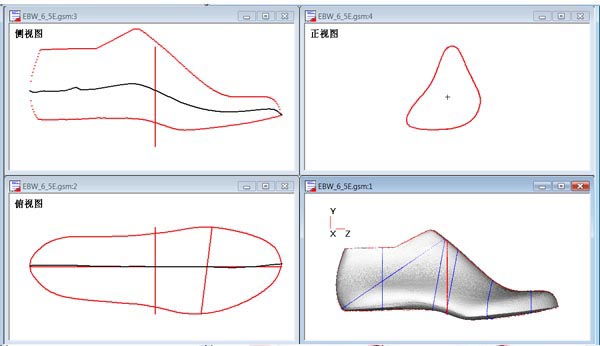 启动程序后,从菜单"文件->打开鞋楦",以显示打开鞋楦对话框。你可以从文件夹Samples选择一个文件,然后单击"打开"(Open)按钮打 开文件。不过我们先来打开一个标准鞋楦,浏览到文件夹"鞋楦库"(LastLib,从Samples文件夹往上两级),选择并打开文件EBW_6_5E.gsm。鞋楦模型将以下图所示的默认布局显示。