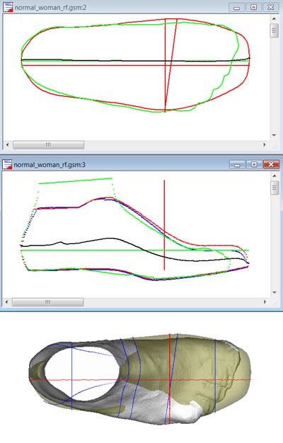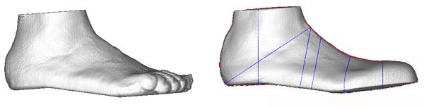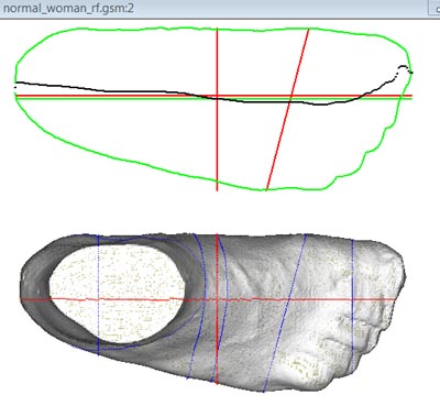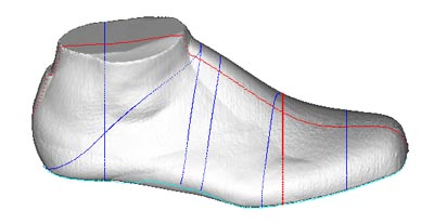 用菜单"文件->打开鞋楦"命令,选择并打开"samples"文件夹中的脚模型"normal_woman_rf.gsm"文件。 用菜单"常用->加载鞋楦模型作为参考模型"命令,将脚模型加载为参考模型。 按"初步操作"一文的方法定义斜宽线。结果如右图所示。 注意:正确定义斜宽线是非常重要的。 |