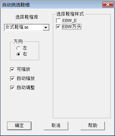 用菜单"常用->自动选择鞋楦"命令,打开挑选鞋楦对话页,如右图所示。 用"选择鞋楦库";下拉菜单选用"女式鞋楦.TXT"。 在"方向"选项中,选右脚。 在"选择鞋楦样式"中选择你需要的样式。本例选用"EBW方头"鞋楦。该鞋楦是"鞋头设计及替换鞋头"一文中生成的,在"鞋楦库扩展"一文中加入鞋楦库的。 点击"确定"按钮,程序将测量脚模型的尺寸,加载所选的鞋楦,并调整鞋楦尺寸来适合脚模型。 你可以在各视图中检查鞋楦尺寸是否合适,如下图所示。必要时可用本程序的其它功能进一步调整鞋楦。 |