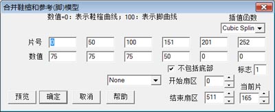 如果你希望鞋楦更接近脚模型,尤其是在脚跟部位,可以以下命令将鞋楦和参考模型(脚模型)合并。 先使用菜单"工具->设置修剪标记"命令自动定义修剪标记。 然后使用菜单"常用->合并鞋楦和参考模型"命令打开"合并鞋楦和参考(脚)模型"对话页。如右图所示。程序在模型上取6个横截面,由"片号"控制(对应实体视图中的垂直黄线),由用户选取。对应6个横截面上合成方式由对应的"数值"控制,用户可在0至100范围內选取,0:完全用鞋楦形状;100:完全用参考(脚)模型形状。 |
