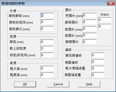 用菜单"常用->手动选择鞋楦"命令,打开挑选鞋楦对话页,和"脚模型定制鞋楦"相同,选择适当选项。 点击"确定"按钮,程序显示如右图所示的对话页。 在"鞋楦或脚的参数"对话页中输入脚的尺寸,点击"OK"按钮。程序将加载所选的鞋楦,并调整鞋楦尺寸来适合脚尺寸。 提示:你不必输入所有参数,如果某一参数值为0,程序将忽略该参数。 |