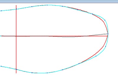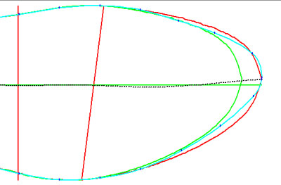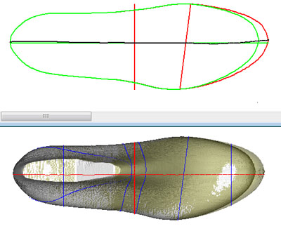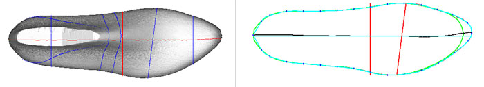 点击菜单"常用->显示轮廓线";然后再点击菜单"常用->调整轮廓线"。在"调整轮廓线"对话页中,点击"设置默认"按钮。 使用鼠标拖动轮廓线(湖蓝色线)的控制点,使其形如右图所示。在"调整轮廓线"对话页中的"开始片"栏中填入140,然后点击"预览"按钮预览调整结果。如果对结果不满意可继续调节。如果满意,点击"确定"按钮完成操作。 新生成的尖头鞋楦结果如下图所示。 |
