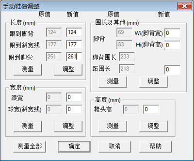 打开鞋楦"EBW_6_5E.gsm"。为于便于显示调整结果,点击菜单"常用->加载鞋楦模型作为参考模型"命令打开了一个参考模型。尖头鞋楦需要在鞋头增加一些空间。先用以下步骤增加斜宽线至鞋尖空间: 点击菜单"常用->定制调节",程序显示"鞋楦测量"对话页,点击"继续"按钮,程序显示如右图对话页。点击"长度"区中的"测量"按钮。在"长度"区中的三个度量中,保持前两个不变;跟到脚尖长改为261,增加10mm。点击"长度"区中的"调整"按钮,完成操作。 |