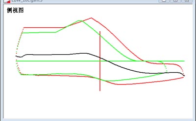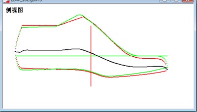 | 调节鞋楦尺寸使当前鞋楦与参考模型尺寸相当。 用菜单"常用->鞋楦尺寸",打开鞋楦尺寸对话页。由于美制鞋楦10号比6.5号大3.5号,长度多出29.6mm(参考鞋楦尺码及调整一文),在长度调整栏中输入-29.6,点击确定。点击菜单"常用->显示旧片",清除不必要的线条。侧视图如右图所示。 |