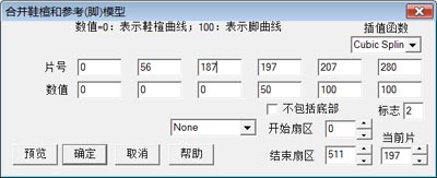 点击菜单"常用->合并鞋楦和参考模型",显示如右图的对话页。以斜宽线(片号197)为界前后20片(约20mm)为过渡区。斜宽线之前,在数值栏中填入100,斜宽线之后填入0。取消"不包括底部"的勾选,在“标志”一栏中填入2。 点击"预览"键预览结果,点击"确定"键完成操作。 |