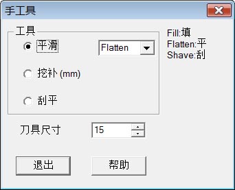 打开鞋楦文件"EBW_6_5E.gsm"。 点击菜单"常用->手工具",打开手工具对话页,如右图显示。它有3个工具选项:平滑,挖补和刮平。 它有三个工具选项: 挖补:用于挖低或抬高表面,当在右边的对话栏中输入正数->抬高表面,负数->挖低表面。 刮平:强力的表面平滑工具。 刀具尺寸:用来调节修改区域(近圆形)的半径。