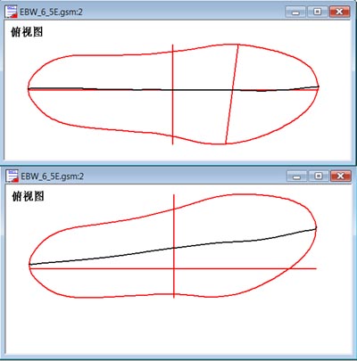 打开鞋楦"EBW_6_5E.gsm"(该文件是在LastLib文件夹中)。 点击工具栏上的图标 假设斜宽线的斜角是-8度。现在要将鞋楦旋转8度,使斜宽线处于垂直方向。方法如下: 点击菜单"常用->鞋楦转向",显示鞋楦转向对话页。在"俯视图中旋转角"一栏中输入8,即转动8度,点击"确认"键完成鞋楦转动。俯视图中的图形如右下图所示。 提示:用户也可单击菜单"查看->视图模式->坐标旋转"进入坐标旋转模式,然后用鼠标拖动来完成。 |