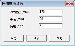 点击菜单"常用->鞋楦弯曲",打开如右图的对话页。我们分三次弯曲来完成鞋楦修改。 输入:Z轴位置=160;半径=20;角度=5,点击"确定"按钮完成一次修改。 再做一次 最后一次 |