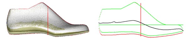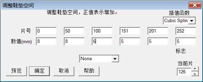 点击菜单"工具->修改工具->调整鞋垫空间",程序显示"调整鞋垫空间"对话页,如右图所示。 程序将鞋楦全长分为5段,用户设置每端点(6个)横截面位置(片号.),见(S)实体视图中的垂直黄线,及相应点的调整值(数值)。 假定要在跟部增加8mm,前部增加5mm。输入合适的数值如右图所示。点击"预览"按钮,来观察调整结果。点击"确定"按钮完成调整。 |