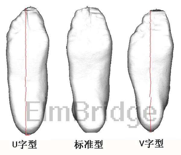 通常批量生产的皮鞋是以标准脚型为基准的鞋楦生产的。对于那些比较幸运人,他们的脚接近标准脚型,因此容易买到合脚的皮鞋。为了扩大销售量,鞋厂会生产一 些宽型(尺码带W字母)的皮鞋,这样减轻部分宽脚型者买鞋难的问题。但并没有解决买鞋难的问题。使问题更复杂化的是脚球宽(斜宽线上的宽度)和脚跟宽的比 率不是固定的。下图显示了球宽小、跟宽大的U字脚型,以及球宽大、跟宽小的V字脚型。