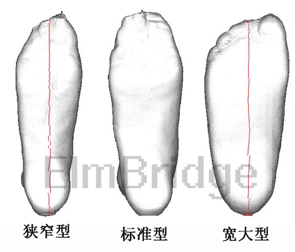除了满足个性化申美需要之外,用以脚的尺寸和形状为基础的鞋楦定制皮鞋也确实有其必要性。每个正常人的脚除了长度尺寸的差异之外,相对的其它尺寸也会有很 大的差别。本文仅以相对宽度来谈谈这种差别。下图显示了三种不同宽度的脚型(下面图片中的脚模型是将受试者的脚制成石膏模型,然后用激光扫描仪生成数码模 型,未加任何调节)。