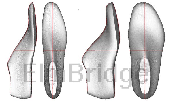 (ii)以激光扫描仪(扫描脚或脚的石膏模型)获得的脚模型为参考来自动或手动调节已有的鞋楦模型。由于这种方法可以直观、准确地调节鞋楦模型的整体和局 部尺寸和形状来适应脚尺寸和形状,可以轻松完成合脚美观的鞋楦。这种方法非常适合有局部变形的脚,例如:常见的拇趾囊肿(拇趾关节肿大)、脚趾扭曲。