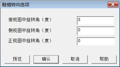 点击菜单"常用->鞋楦转向"命令打开"鞋楦转向选项"对话页,如右图所示。请注意:此操作无复原功能。 为于便于显示操作结果,用以下命令打开了参考模型:从菜单"常用->加载鞋楦模型作为参考模型"。 |