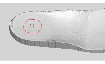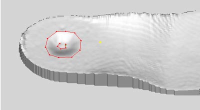 点击菜单"鞋垫区域->鞋垫区域内调整"命令,程序将按调整点的设置值(用"设置鞋垫调整点值")及其它选项(用"更改鞋垫区域属性")对鞋垫区域内的模型表面进行调整。如果对结果不满意,可以用手工具继续修整,或用复原功能恢复原状。 右图显示了鞋垫区域调整结果。这种调整常用于跟骨骨刺患者鞋垫的跟部调整,可以降低因骨刺引起的局部疼痛。 |