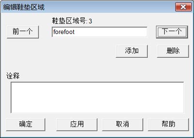 点击菜单"鞋垫区域->编辑鞋垫区域"命令,程序显示如右图所示对话页。 在此对话页中,你可以使用"上一个"或"下一个"按钮来选择一个当前鞋垫区域。当前鞋垫区域在鞋垫视图中显示为红色,其他鞋垫区域为深棕色。使用"添加"按钮添加新的鞋垫区域或"删除"按钮删除当前鞋垫区域。 用户也可以修改鞋垫区域名,点击"应用"按钮完成修改。 |