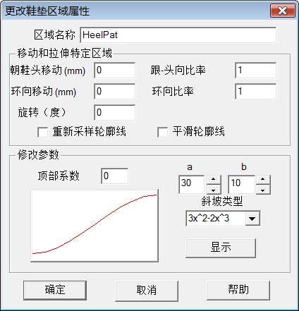 斜坡类型:从边界(点)到调整点的过渡曲线。 在设置参数后,点击"确定"按钮完成更改鞋垫区域属性。 |