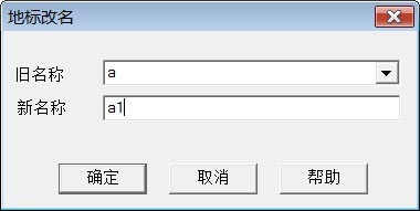 | 点击菜单"地标->地标改名",程序显示右图所示对话页。在"旧名称"下拉菜单中,选择一个要改名的地标,例如a,在"新名称"栏中填入新名称,例如a1,然后点击"确定"按钮完成地标改名。 | ![]() |