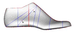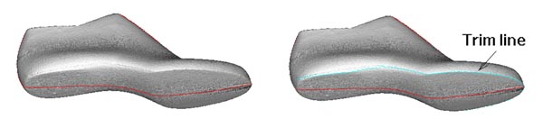 本命令自动在当前鞋楦模型中设置修剪线,如下右图中箭头所指(Trim line)的湖蓝色线。请参考"查看"一文中的"显示修剪线"。
