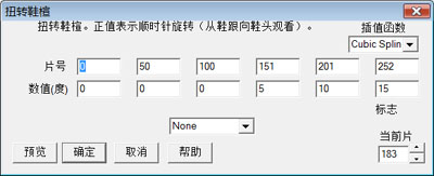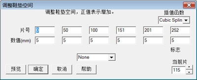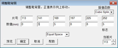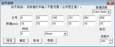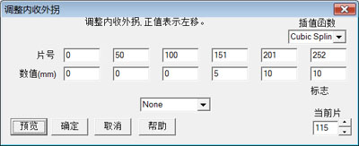 对应以上所述6片号(横截面)的修改量应填入片号下对应的6个输入栏中。片与片之间修改量的过渡由对话页右上角的插值函数控制,它有三个选项: