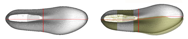 点击菜单"工具->修改工具->调整内收外拐",启动"调整内收外拐"对话页。 右图是一个调整鞋楦内收的例子。调整前后的鞋楦在实体视图中的形状见下图。左图是调整前的鞋楦,右图是调整后的鞋楦(为便于比较同时显示了鞋楦原形)。 |