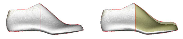 点击菜单"工具->修改工具->调整鞋背面",启动"调整鞋背面"对话页。 右图是一个增加鞋楦背面高度的例子。调整前后的鞋楦在实体视图中的形状见下图。左图是调整前的鞋楦,右图是调整后的鞋楦(为便于比较同时显示了鞋楦原形)。提示:点击工具栏上的图标 |