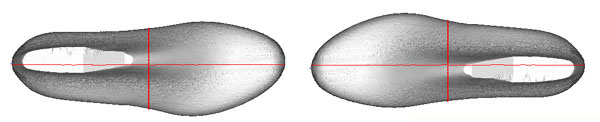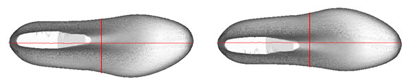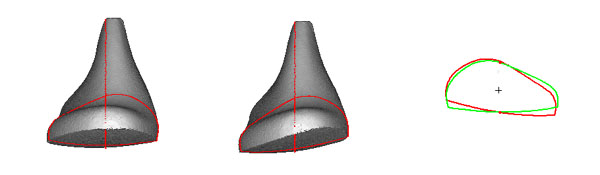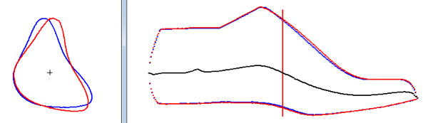 调整前后的鞋楦在正视图(横截面)中的形状见右图。红线是调整后的鞋楦。本操作可重复使用。 |