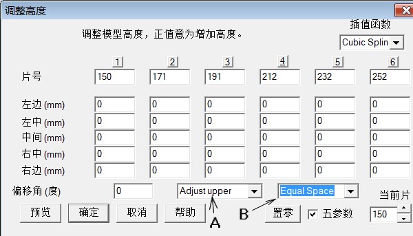 (2)Seg. Cubic(区间三次函数)插值。每个控制截面的调节量不影响其他片截面的调节量,整个调整区域的调节量是光滑过渡。