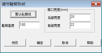 打开鞋楦"EBW_6_5E.gsm"(该文件是在LastLib文件夹中)。 点击菜单"常用->调节鞋帮形状",显示调节鞋帮形状对话页如右上图所示。 与此同时侧视图中显示绿色的曲线及控制点。用鼠标拖动控制点可改变曲线的形状。用户可以在"鞋帮高度"栏中输入所需高度,然后点击"默认轮廓线"来设置鞋帮轮廓线,最后调节控制点位置来设定轮廓线。 在"筒口宽度"栏中设定筒口前、后部的宽度。点击"预览"预览修改结果,点击"确定"完成修改。 |