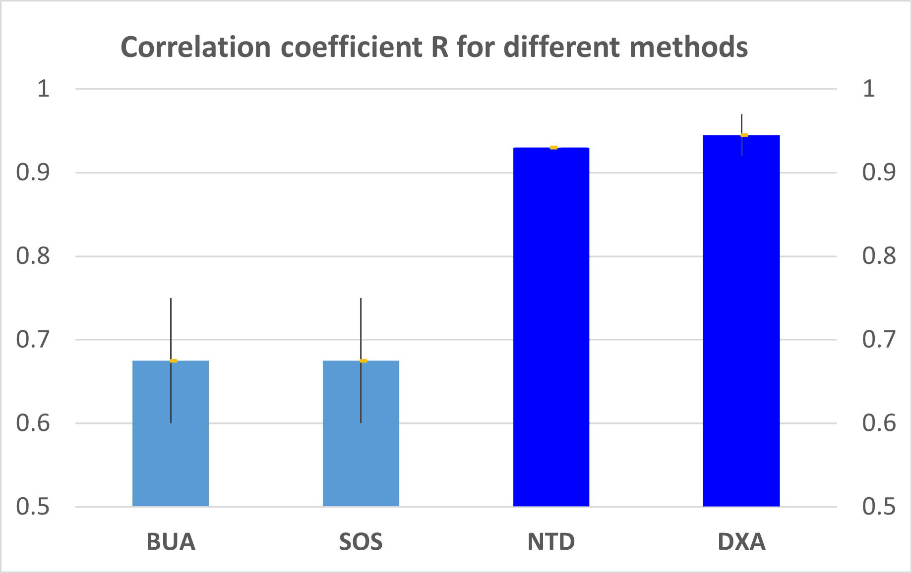 The UltraScan™ 650 is the first and only FDA-approved ultrasound bone densitometer that replaces DXA for measuring Bone Mineral Density without radiation. Bone mineral density (BMD) is the most important factor in determining the risk of osteoporotic fracture. The UltraScan™ 650 uses novel patented net time delay (NTD) technology which allows measurement of the quantity of bone, which in turn provides a direct evaluation of BMD; thus the UltraScan™ 650 is a true "ultrasound bone densitometer". A clinical study conducted at Columbia University shows that its output, BMDUS, is highly correlated (r = 0.931) with x-ray based (DXA) measures of BMD. BMDDXA has‒‒until now that is‒‒been the “gold standard” for bone assessment. In contrast, other bone sonometer products on the market utilize conventional measurement parameters such as SOS and/or BUA. These parameters exhibit significantly lower correlation with BMD, usually less than 0.8, and thus these products perform very poorly in identifying individuals with osteoporosis. A summary of the relevant studies are provided here. The figure below compellingly demonstrates that the NTD technology employed by the UltraScan™ 650 not only possesses a high level of accuracy comparable to that of DXA, but its accuracy is also significantly superior to that of traditional BUA and SOS measurement methods.